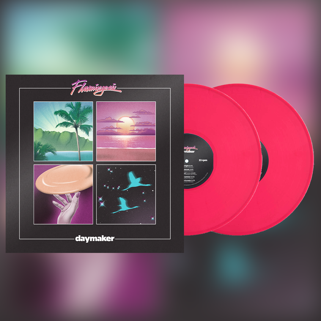 Limited edition 180 gram double-LP pink vinyl pressing of Daymaker from Flamingosis. Includes Side D art etching.
