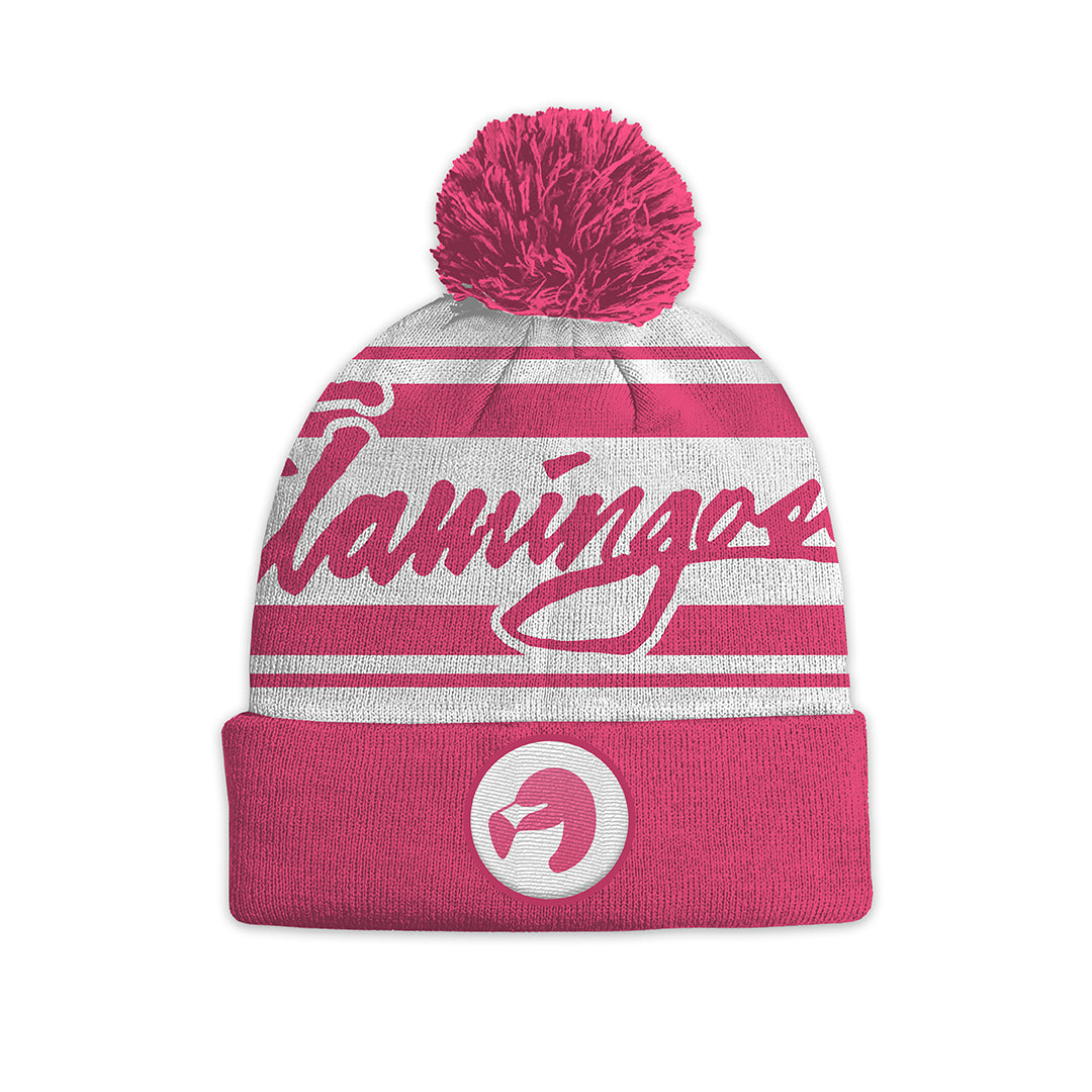 Flamingosis Pom Embroidered Wool Beanie. Flamingosis is knit into the hat, and the logo is embroidered on.